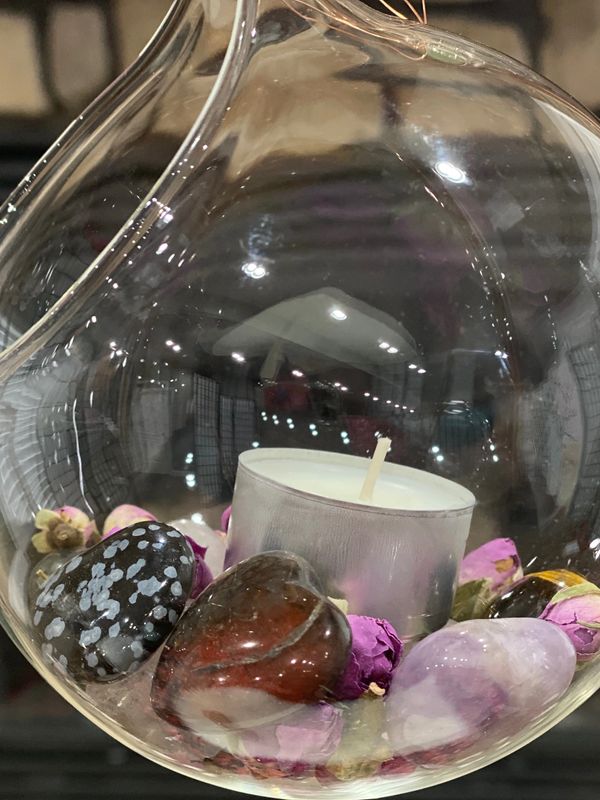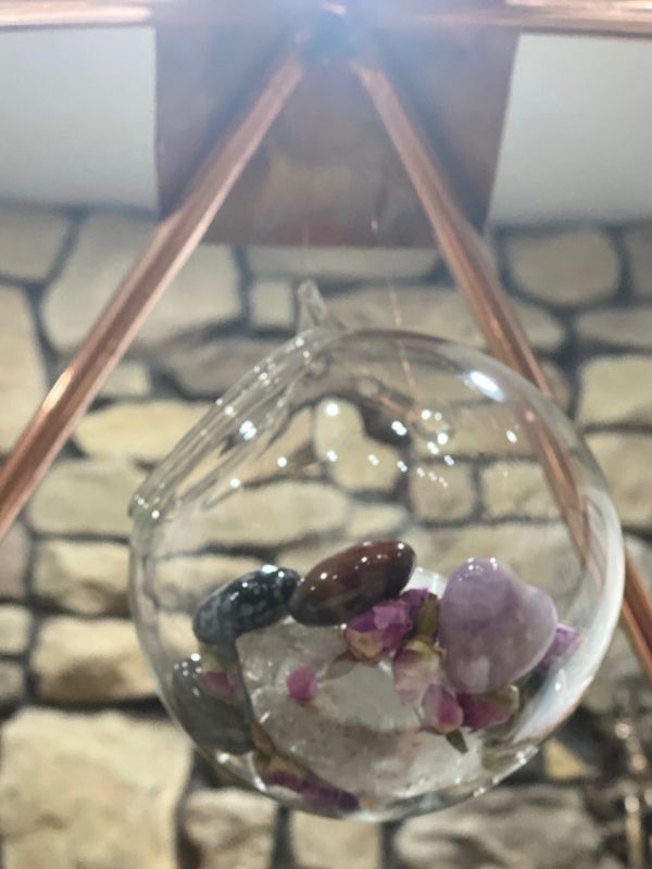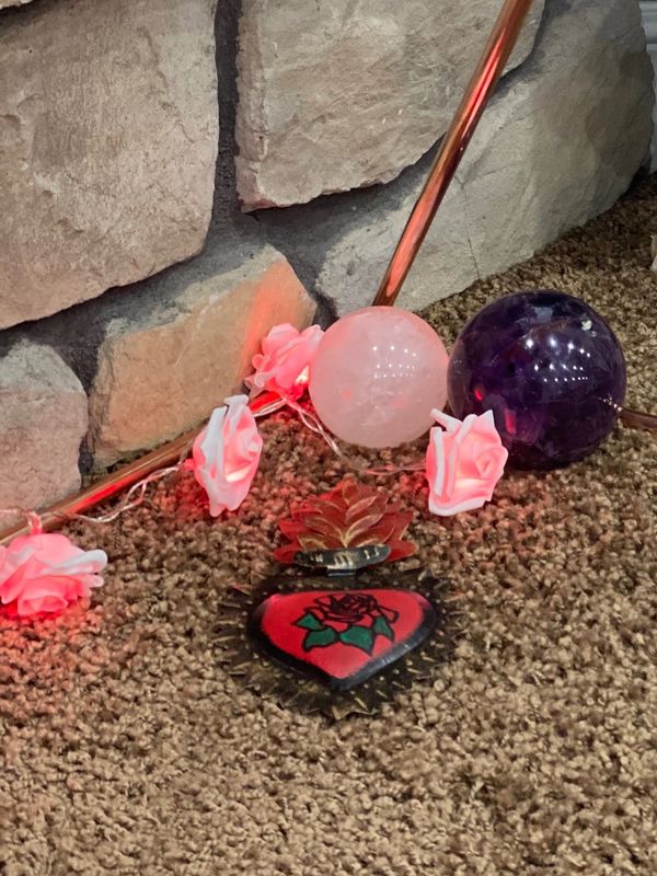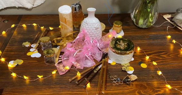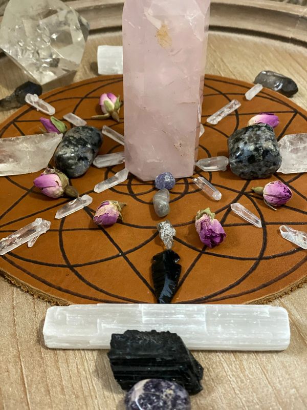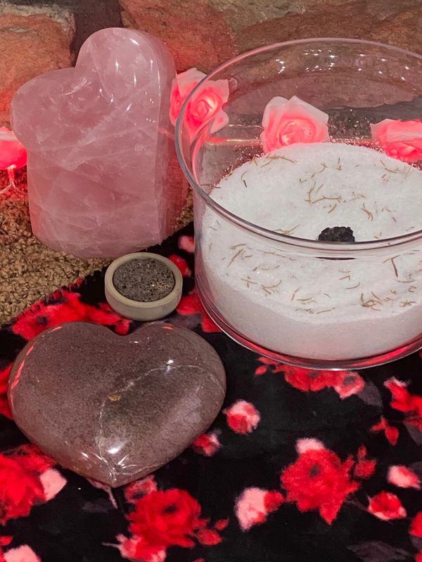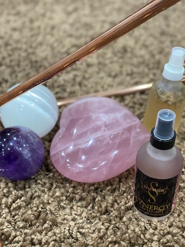 And still that's not all! Embrace a rose quartz crystal heart, a blue calcite crystal, a Love&Light crystal smudge spray, a Heart-Zenith anointing oil, a heavenly rose, a personalized pendulum, and a bag bursting with crystal goodies - quartz gems, bee charms, rose quartz bits, a sweet bee tea light, lavender, sage, pine, and a jar of honey.